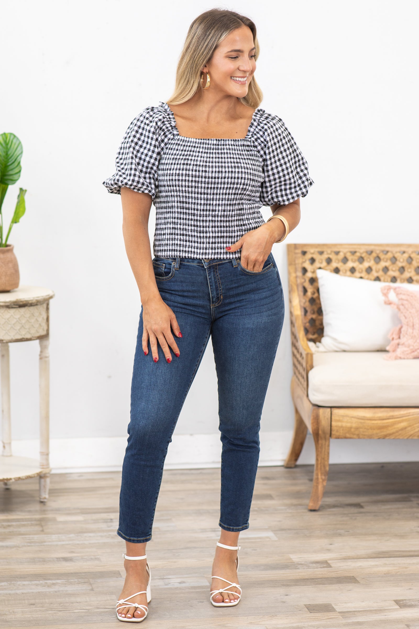 Black and White Plaid Puff Sleeve Woven Top 79682450
